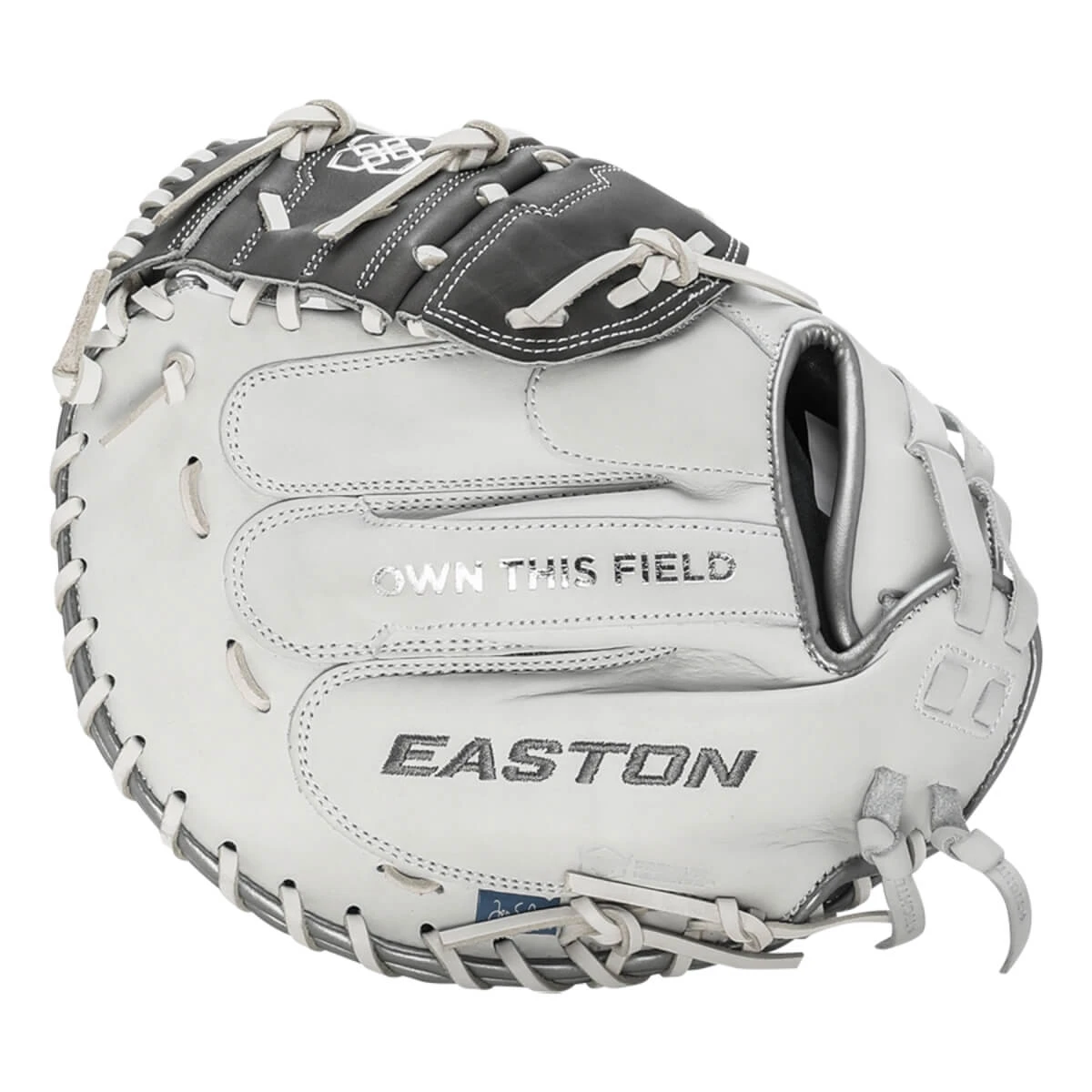 And it would be remiss of us if we didn’t note the touches of swagger that have been added to the mitt. You’ll notice in a few spots of the mitt (both sides of the web, catching palm & hand slot) that Jen Schroeder’s personal logo has been added. Also, Easton placed the quote “Own This Field” on the mitt’s backing so that ladies wearing the mitt know to take charge from the backstop!